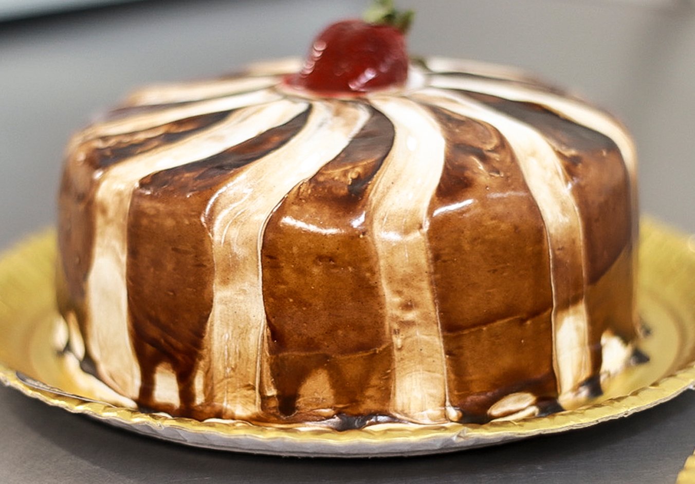 A Torta de Mesclada de Baba de Moca com Nozes da Gamela é feita com pão de ló branco e possui 2 camadas de recheio. Uma camada de baba de moça e outra camada com creme de nozes trituradas. Por cima da torta usamos a decoração com Chantilly e Calda de Caramelo, o que garante uma apresentação sofisticada e muito saborosa.