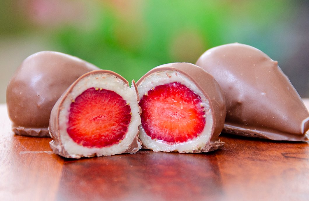 O Bombom de Morango da Gamela é feito de modo artesanal. O morango é envolto no creme de leite condensado e depois é coberto com chocolate ao leite derretido. Sua textura macia e saborosa agrada os paladares mais exigentes.