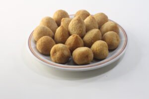 A coxinha é levemente temperada com pimenta de cheiro e pimenta do reino.