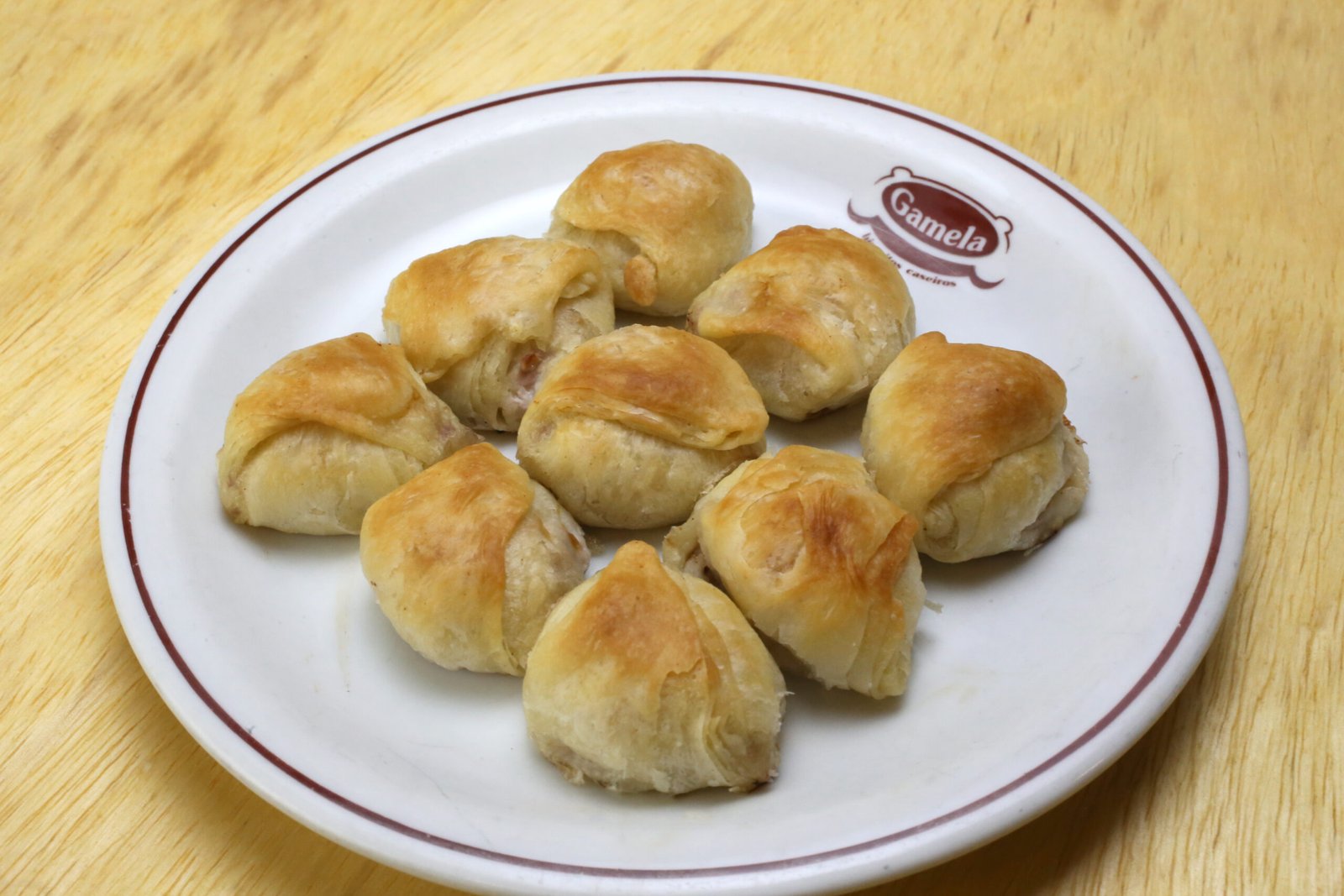 A Esfirra de Pernil da Gamela é temperada com sal, pimenta do reino e limão. Assada em massa folhada leve e sem leite, agrada a muitos paladares desde 1977.