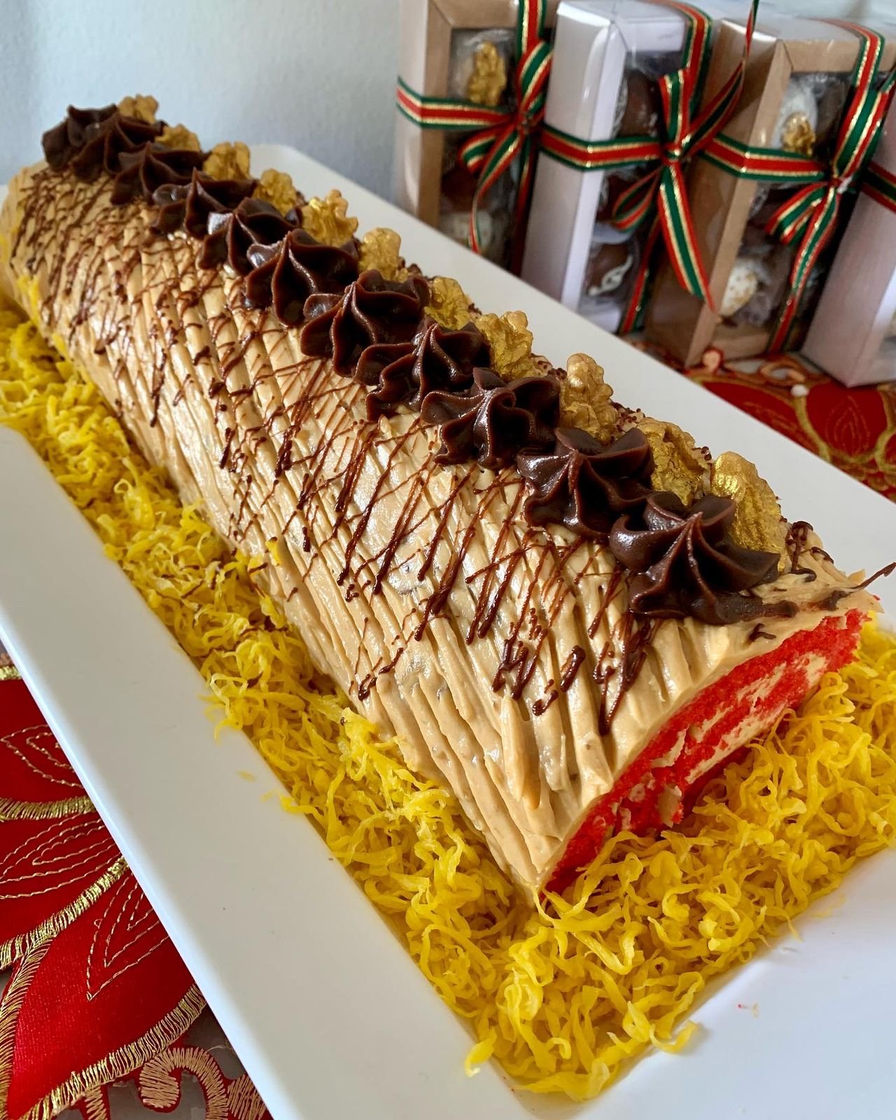 O Rocambole Red Velvet da Gamela foi pensado para nosso cardápio de NATAL. Ele é feito com o pão de ló vermelho de textura muito leve e macia (aveludada), sendo recheado com doce de leite e nozes. Nossa decoração alegre também leva ao redor o famoso fios de ovos da casa, que contrasta com o sabor do rocambole.