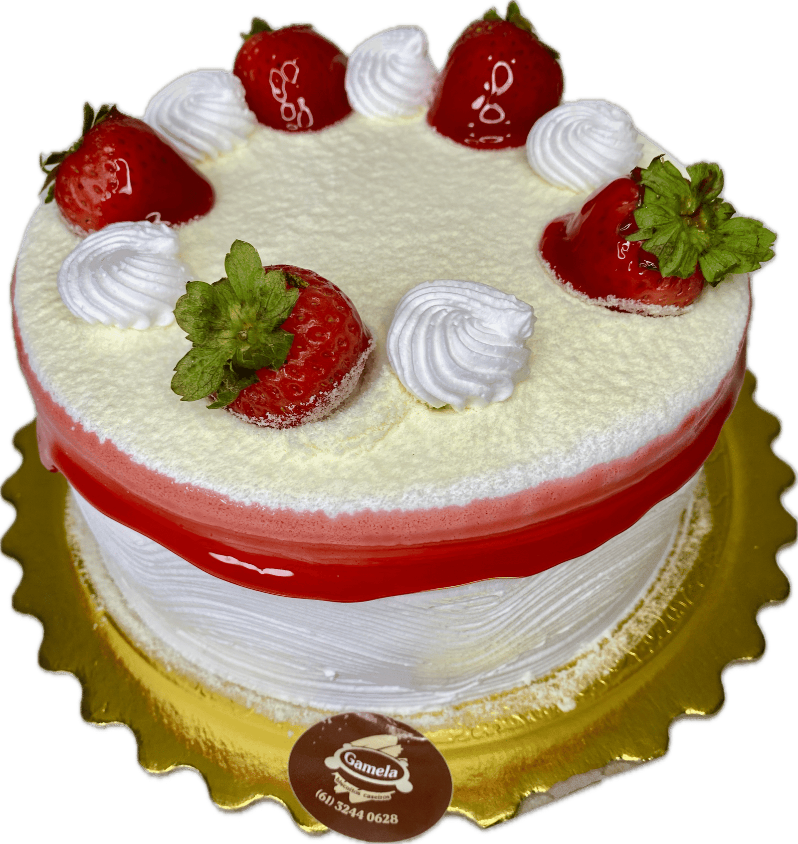 A Torta Leite Ninho com Morango da Gamela é feita com pão de ló branco e possui 2 camadas de recheio.